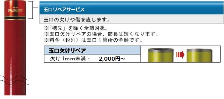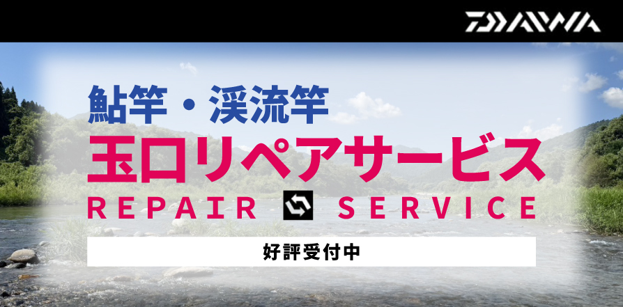 - ダイワ製品お取扱いの販売店にて、修理カードに玉口リペアサービスと記載していただき、お申込み下さい。予算を超える場合は見積もり・修理せずに返却のチェックをお願い致します。